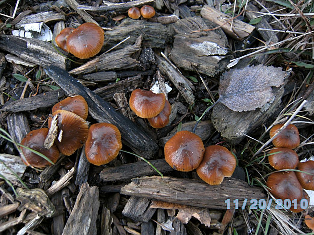 Bei diesem bin ich mir in der Gattung unschlüssig. Das Aussporen ergab schwarzbraunes Sporenpulver, daher vielleicht eine Psilocybe? Wie man sieht, auf Rindenschrot gewachsen. Hut ca. 2 - 3 cm breit, Stielbasis auffallend striegelig-filzig und mit etwas Phantasie schwach grünlich. Arbeitstitel: Psilocybe sylvatica.