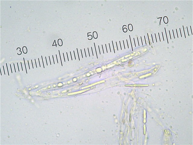Hallo Andreas, Lothar, Seraph Ich habe nochmals mikroskopiert. Zuerst zu den Sporen: Sie zeigten sich sehr unterschiedlich, mal mit vielen kleinen, mal mit wenigen langen Öltropfen, die fast die ganze Spore ausfüllten. Im Wasser konnte ich ihre effektive Grösse oftmals kaum ausmachen, weil ich vor lauter Öltropfen nicht sah, wo die Spore beginnt und wo sie aufhört. (Siehe Bild, unter dem Ascus) (x2,5)