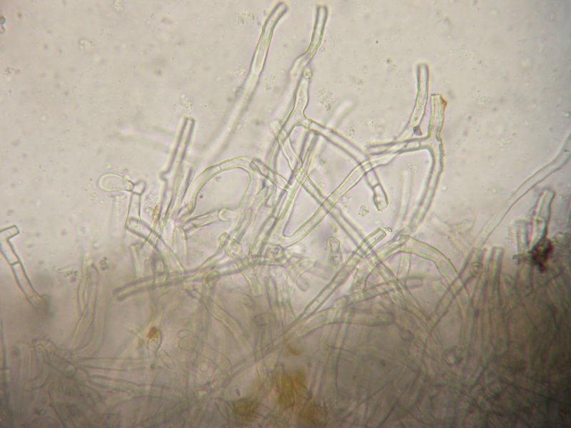 | Hallo Wolfgang, den Fund hatte ich schon im Juli gemacht und habe leider kein Exsikkat davon. Es ist mir aber möglich, den Standort wieder aufzusuchen. Die bisher von mir untersuchten Rindenpilze erwiesen sich alle als standorttreu, so dass ich meine Untersuchungsarbeit im neuen Jahr fortsetzen werde. Diese Vorgehensweise ist für mich obligat, da ich mir bei den meisten Funden mehrmals Material vom gleichen Standort hole um eine ausreichende Dokumentation der Kollektionen zu erstellen (Makro-/Mikrofotos, Beschreibung, Sporenstatistik). Ein Foto von der Hyphenstruktur hatte ich damals schon gemacht. Man sieht darauf rechtwinklig verzweigte Hyphen. Allerdings muss ich die Zystiden nochmals untersuchen. Viele Grüße