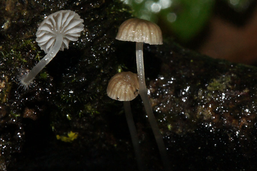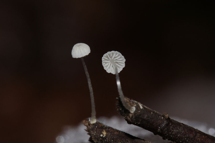 Die Pilze werden kleiner, eine behaarte Mini-Mycena, rein weiß mit glasigem Stiel, ca. 5 mm lang, auf kleinen Ästchen, noch nicht weiter gesucht: