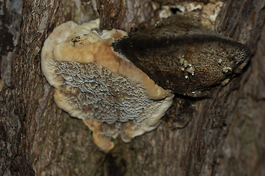 Zum Schluss noch ein Porling, eigentlich peinlich, dass mir (als Porlingsfreund) dessen Benamung schwerfällt. In der Dämmerung geblitzt, an einer sehr alten Weide, Hut filzig ocker-beige, Trama wässrig knorpelig, den Geruch würde ich mit Anis vergleichen. Wenn, dann habe ich so junge und frische FK noch nicht gesehen - Trametes suaveolens?