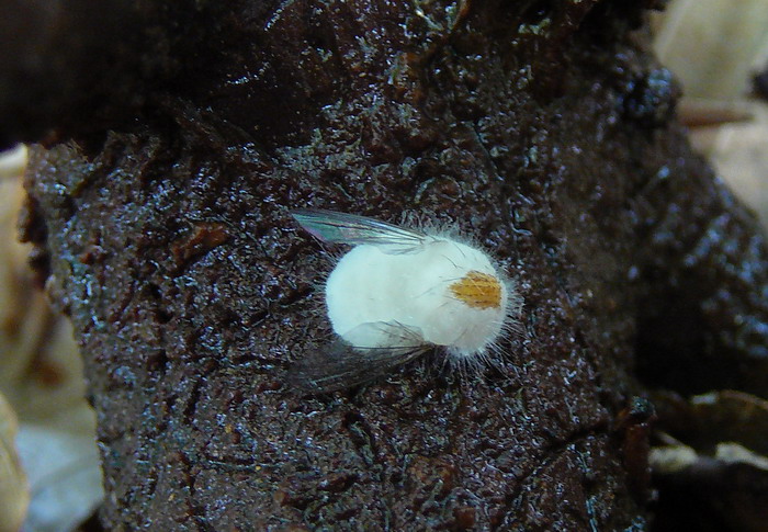Liebe Pilzfreunde diese arme Fliege haben wir im Sommer in der Pfalz gesehen, und wir fragten uns, was hier wohl passiert sei. Durch Zufall las ich heute noch mal einen Artikel im Tintling Heft 5/2010, wo von einen Pilz namens Entomophthora muscae FLIEGENTÖTER berichtet wird.