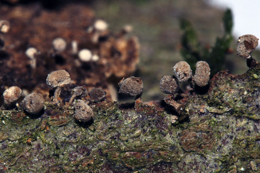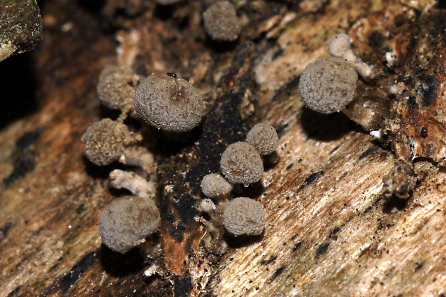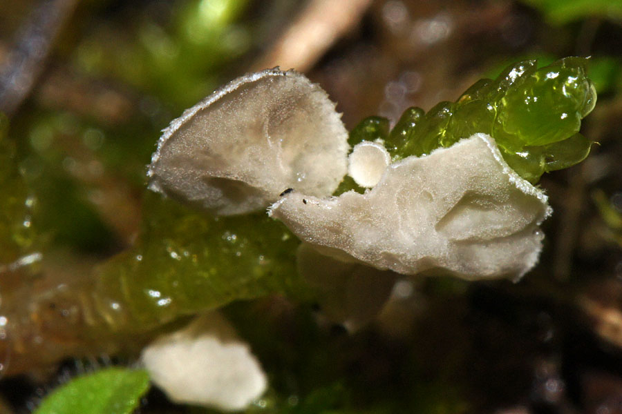 In der Kiesgrube Weilbach angekommen wars schon sehr düster, im Moos konnte ich meist nur noch Umrisse erkennen und musste mich durchblitzen, sorry für die Blitze, ich mag solche Bilder auch nicht. Die winzigen weißen Flecken im/am Moos fielen trotzdem auf, das sollte Arrhenia retiruga sein: