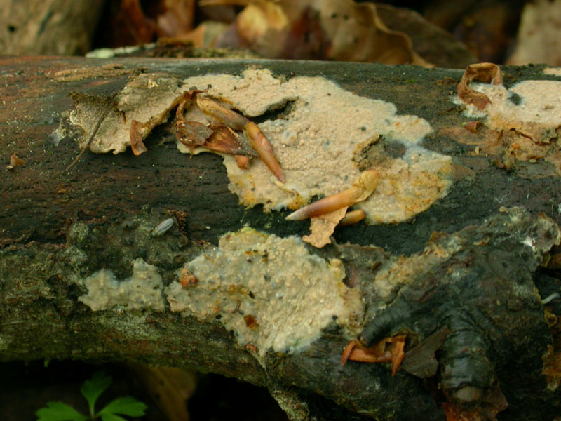 Liebe Pilzfreunde, nach der langen Winterdurststrecke möchte ich euch einen Wachsbelag vorführen, den ich letztes Jahr schon am gleichen Holzstück entdeckt habe. Meine Bestimmungsversuche enden immer in der Gruppe um Phlebia livida. Wer kennt sich ein bissel aus mit den Rindenpilzen und kann mich korrigieren oder meine Bestimmung bestätigen. Basidiokarp: