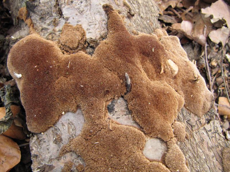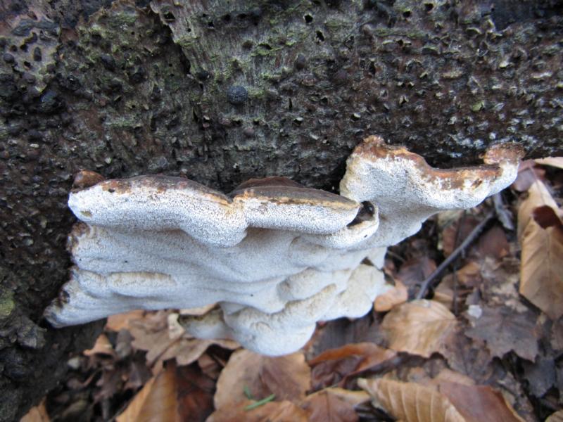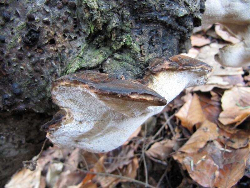 2) Ein Feuerschwamm (Phellinus). Vermute ja P. ferreus... Substrat müsste den umgebenden Bäumen und den noch zu sehenden Substratabschnitten nach Rotbuche sein.