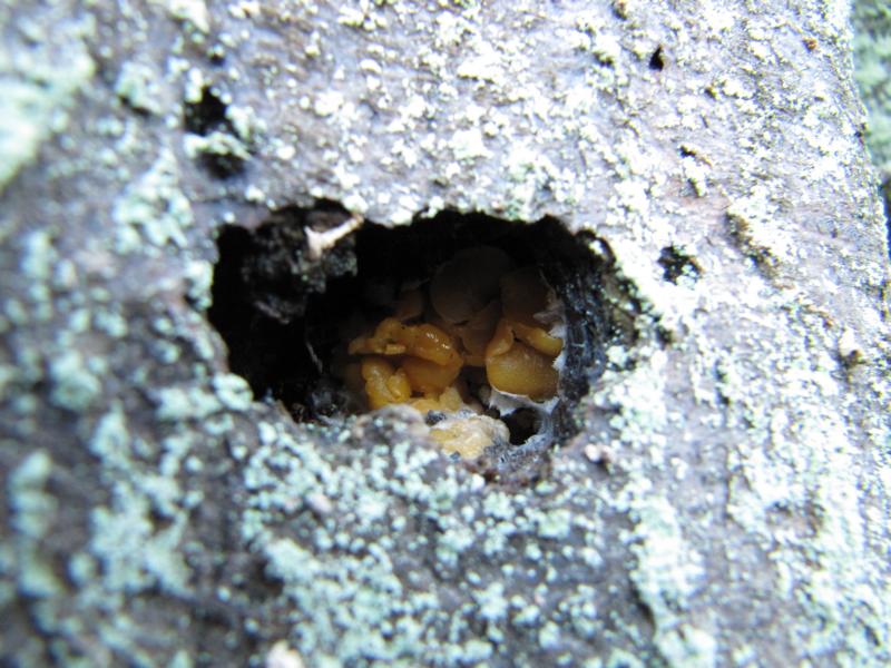 5.1) An der Spitze waren sie mit einem cremefarbenen Schleim überzugen. Sie waren sehr biegsam und elastisch und dort zu finden, wo die Rinde aufgeplatzt ist.