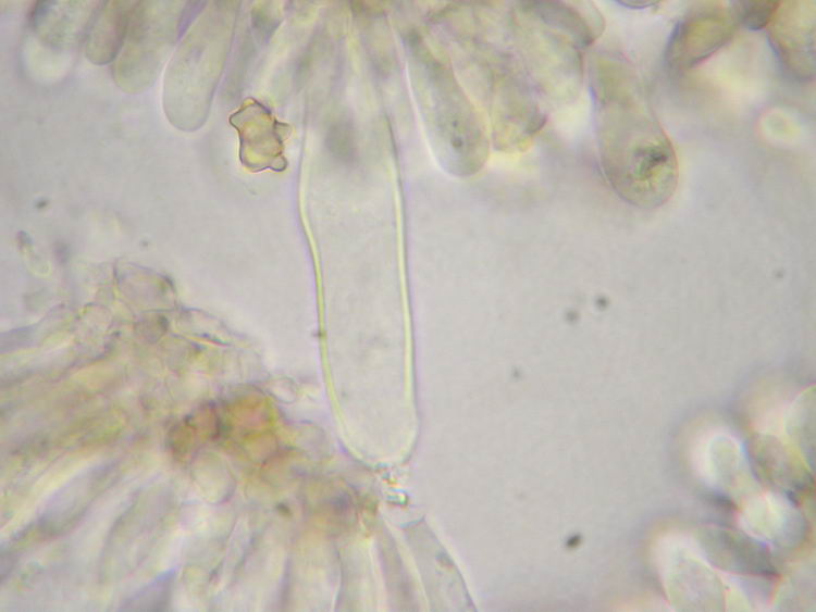 Die Hymenialzystiden sind ziemlich dünnwandig und spärlich beschopft:
