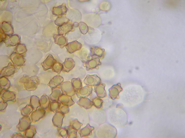 Die Sporen zwar klein, jedoch mit recht gut ausgeprägten Höckern, Maße Maße: 7,5 x 6,1 (6,5-9 x 5-7), Q=1,24: