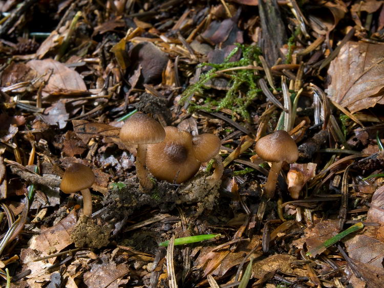 Die kleinen Pilze (Hutdruchmesser nur bis 1,6 cm!) sehen aus wie eine Miniaturausgabe der Inocybe soluta vom 5. September 2009 vom Tegernsee , besonders Farbe und beschaffenheit der Hutdeckschicht sind genau gleich; auch die Mikroskopie stimmt recht gut überein; Abweichungen ergeben sich erneut zur Beschreibung bei Stangl: So weisen die Sporen zwar wenige, jedoch meist gut ausgeprägte Höcker auf und sind nicht selten sogar sternförmig, so gut wie nie dagegen viereckig; auch die mehr utriformen Hymenialzystiden zeichnet Stangl etwas anders (fusoid); I. subcarpta ist wohl makroskopisch nicht abgrenzbar, sollte jedoch größere Sporen besitzen (die Sporenform wiederum spricht eher für subcarpta); I. pseudoasterospora var. microspora kommt wohl wegen völlig anders geformter, viel größerer Hymenialzystiden nicht in Betracht; Komplette Beschreibungen und weitere Fotos zu den hier vorgestellten Kollektionen findet ihr auf meinen Inocybe-Seiten unter den Nummern 13 und 15. Grüße aus München