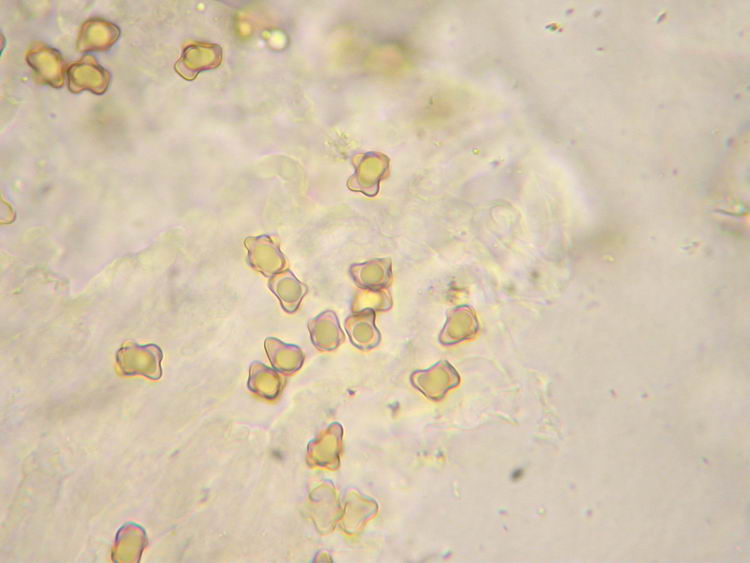 Die Sporen mit gut ausgeprägten Höckern und den Maßen 9,4 x 6,5 (8,5-10 x 5,5-7), Q=1,44: