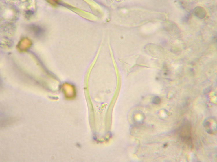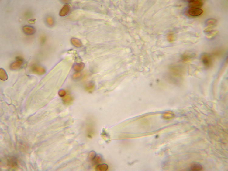 Hymenialzystiden schlank fusoid, blass gelblich in KOH, Kristallbesatz spärlich, dickwandig, recht kurz, ca. 45-60 x 10-15, Wandstärke 1-2,5: