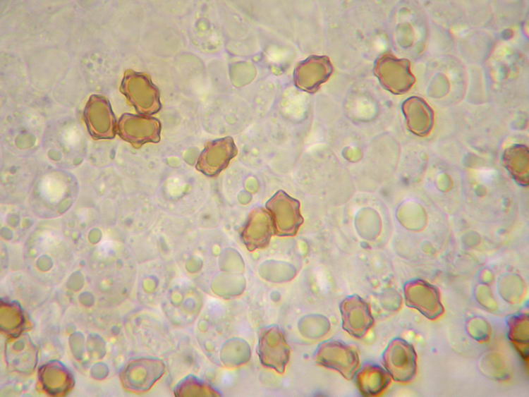 Sporen: mäßig höckerig, Höcker zahlreich, aber wenig vorgewölbt, meist rundlich, seltener (vor allem apikal) auch zapfig, eher klein, Maße: 8,1 x 5,9 (7-9,5 x 5-6,5), Q=1,39 (1,17-1,64):