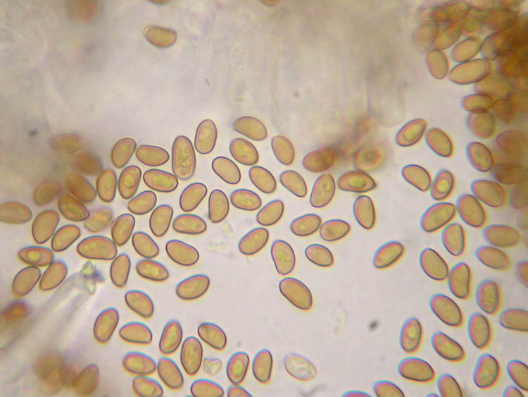 Sporen subamygdaloid, Apex meist schwach konisch, seltener rundlich oder deutlich konisch, lateral bisw. mit Depression, 7,4 x 4,5 (6,5-8,5 x 4-5), Q=1,66 (1,44-1,89):