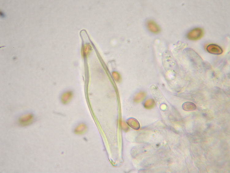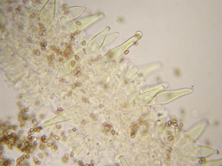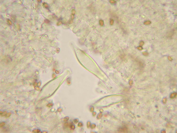 Pleurozystiden: schmal bis breit fusoid, seltener sublageniform, gestielt, metuloid, Besatz spärlich, in KOH +/- hyalin bis deutlich blassgelb, mäßig dickwandig, ca. 60-70 x 15-17, Wandstärke am Bauch ca. 1-2, am Hals 1,5-2: