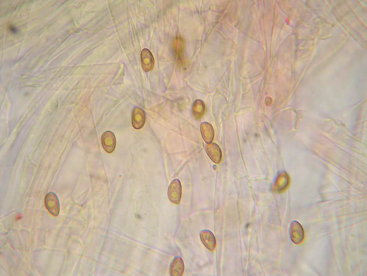 Sporen sehr variabel, überwiegend amygdaloid, aber auch ellipsoid bis ovoid, Apex meist schmal gerundet bis leicht zugespitzt, ohne subapiculäre Depression, im Profil an der Unterseite nur selten mit minimaler Delle; mäßig dickwandig (Wand doppelt), in KOH ockergelb; Maße: 7,9 x 4,8 (6,5-9[9,5] x 4-5,5), Q=1,66 (1,44-1,80), 30 Sp. gemessen: