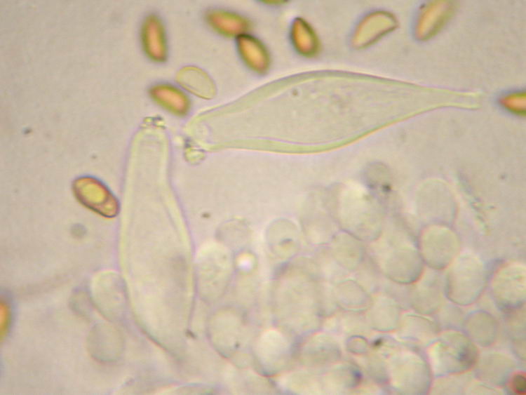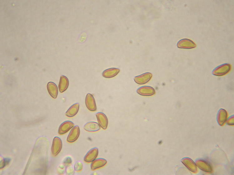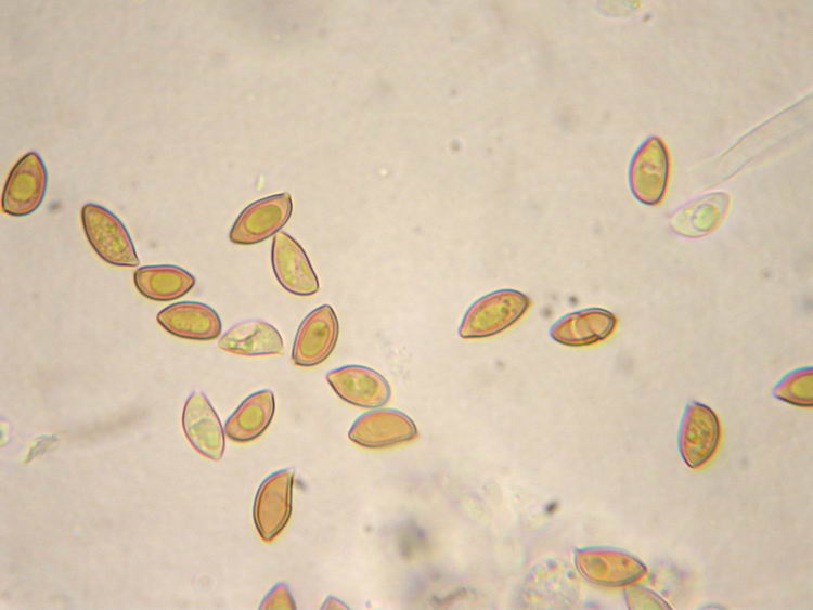 Sporen: amygdaloid, Apex in der Regel konisch und nicht selten papilliert, lateral oft mit Depression, 9,9 x 5,6 (8,5-11 x 5,2-6), Q=1,76 (1,63-1,82):