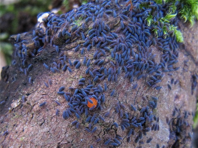 Hallo zusammen Beim Stöckchendrehen fiel mir dieses kleine, etwas violettliche Aststück auf. Es sind lauter Schneeflöhe oder Springschwänze, die sich am orangen Pilz (ev. einer Gallertträne) gütlich tun. Welch hübsche Überraschung! Ligrü und allen eine gute Woche