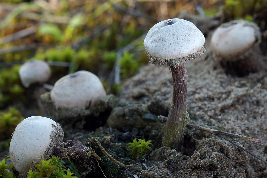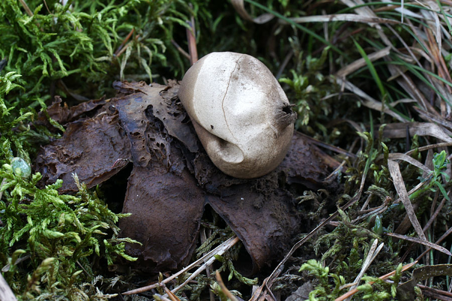 Guten Abend zusammen, Samstag war ich im Wald unterwegs, außer (für mich makroskopisch) unbestimmbaren Mollisien gabs rein gar nix, sehr frustierend. Bei den roten Becherchen war ich die Wochenenden zuvor, heute blieb die Wahl zwischen Bechern und Düne - zudem angefixt von Dieters Beitrag, entschloss ich mich für den Sand. Zumal ich es für eine Frechheit halte, dass sich die gestielten Boviste mit Ausnahme von T. brumale bisher vor mir versteckt hielten. Fünf Stunden unterwegs, am Ende kurz vorm Parkplatz nochmal abgebogen, dann wars endlich soweit. Zunächst aber zu den Sternchen, die wachsen dort, seit ich vor drei Jahren erstmalig da war, jedesmal nur ein oder zwei FK an einer einzigen Stelle im Kiefernwald, jedesmal erwische ich sie viel zu spät. Jedesmal bin ich mit Geastrum triplex noch etwas unsicher: