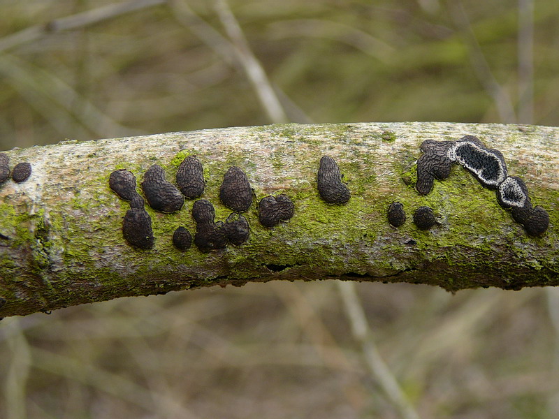 Mein Arbeitsname wäre erst einmal Diaporthe bullata an Weidenholz. Hab aber noch nicht tiefgründig geschaut. Ein Eckenscheibchen ist es doch, oder?