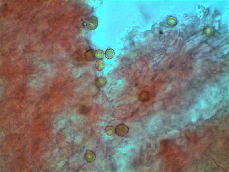 Sporen subglobos und ornamiert. Da fällt mir erst einmal nur Lepista oder Leucopaxillus ein. Hat jemand eine Idee. Etwas Mumie liegt noch im Regal.
