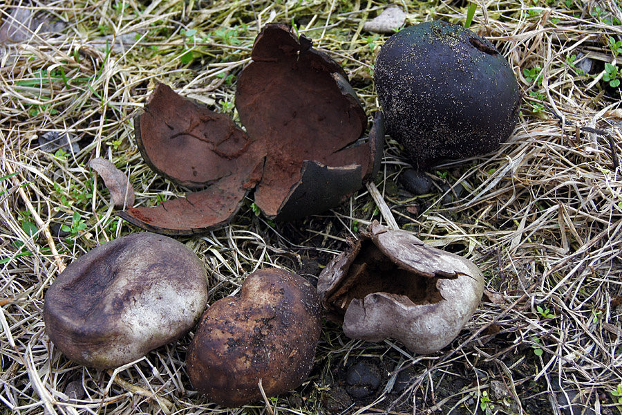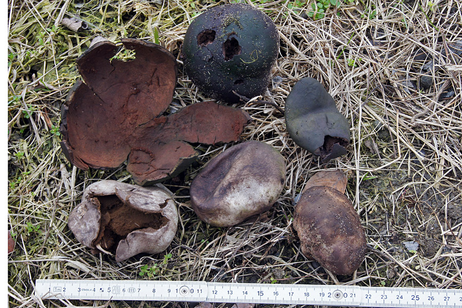 Eine leere Hülle fand ich direkt innerhalb der kleinen Parzelle, auf der wohl die Schafe standen - schätzungsweise vom Wind dorthin geweht. Einige kleinere FK wuchsen wahrscheinlich auch darin, sie waren völlig schwarz, platt getreten und nicht geöffnet.