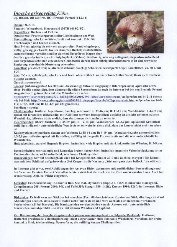 Liebe Inocybenfreunde, ich hab in 2010 bei mir in Wiesenbach eine Inocybe gefunden, die ich jetzt erst untersuchen konnte. Zusammen mit Bernd Oertel bin ich mit den verschiedenen Schlüsseln auf Inocybe griseovelata gekommen. Da sie in Band fünf der Pilze von Baden-Württemberg zwar verzeichnet ist, Andreas dazu aber sagt, dass es nur einen Nachweis wohl ohne Beleg für sie gibt, habe ich eine sehr ausführliche Doku gemacht (die ich hier nur zum Teil reinstelle), und Erminio Ferrari hat sie sich angeschaut und mir die Inocybe als griseovelata gestern bestätigt. Ich zeig sie euch, weil sie eben wohl allgemein selten ist.