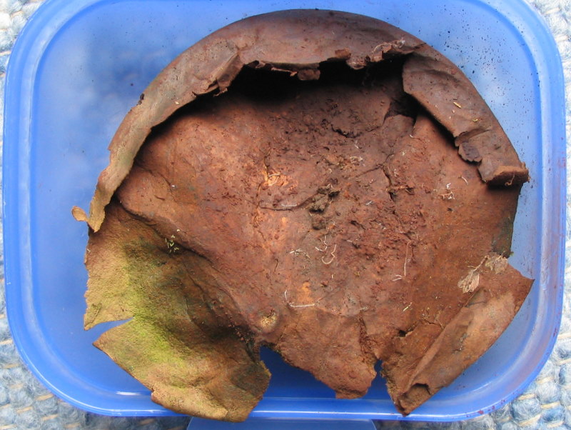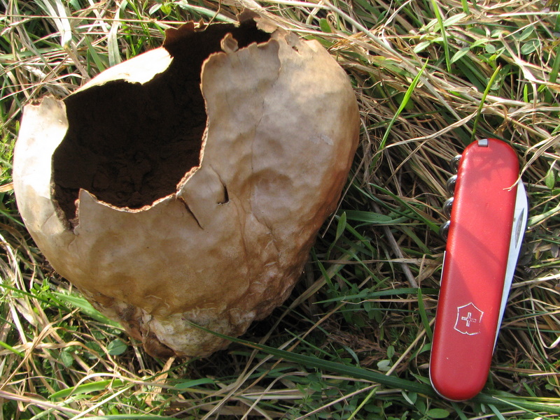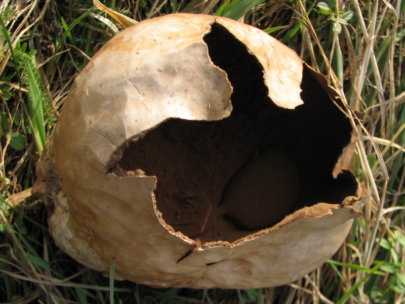 Nach der Sporenuntersuchung (4,5-5 µm, rund, glatt) ist es eine umgedrehte Ruine eines Hasenstäublings (Calvatia utriformis).