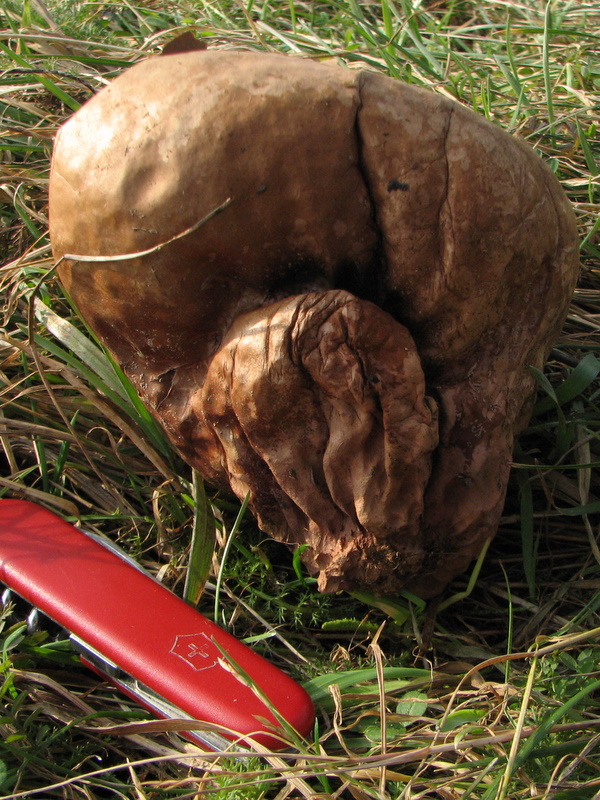 Eine erfahrenere Pilzfreundin brachte mich später dann nach längerer Diskussion auf den Weg der Erkenntnis. Sie meinte in der Spitze des Fruchtkörpers eine Wurzel zu sehen und das sich Stäublinge im reifen Zustand drehen würden. Die „Unterseite“ wurde eingehend untersucht, wobei in den Hautfalten noch etwas Sporenmasse vorgefunden wurde. Großes allseitiges Gelächter…(schäm).