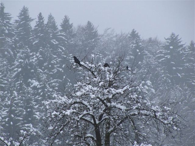 Gestern noch freute ich mich am wärmeren Wetter und bedauerte Andreas und die anderen Nordlichter, die in der Kälte bibberten, während wir den Frühling schon riechen konnten. Heute hocken die Krähen wieder auf dem verschneiten Birnbaum vor unserem Haus...