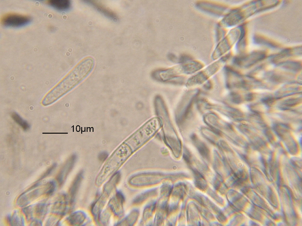 Das Substrat war ein großer, relativ frisch geschnittener Baumstumpf, der auf der ganzen Fläche mit diesem Pilz bewachsen war, bevorzugt auf einer glibbrigen Moderschicht aber auch auf dem nackten Holz. Die Einzelfruchtkörper waren ca. 1 mm hoch, die Köpfchen 0,5 mm im Durchmesser. Bei der Aufsammlung war nieseliges Wetter, also alles gut durchfeuchtet, die FK weisslich durchscheinend und eher gelatinös. Ich habe sie dann trocknen lassen, weil ich ursprünglich an einen Schleimpilz dachte, dabei wurden sie bernsteinfarben, brüchig und fest. In KOH und fast mehr noch in Wasser schwellen sie sofort wieder auf ursprüngliche Größe an. Die Struktur des Köpfchens sind vom Inneren strahlenförmig, gelegentlich verzweigte Hyphen von 4-5 µm Breite nach aussen hin in eine dichte Packung von Konidien übergehend, die nach aussen immer lockerer werden. Ob man das als Synnema bezeichnen kann, weiß ich nicht so genau. Konidien stumpf spindelig, 10 - 30 x 3-5 µm, einige (die größeren)septiert, fein warzig.