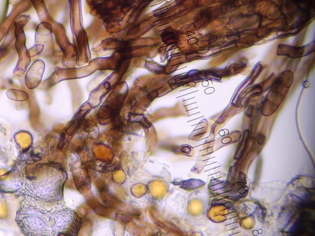 am rechten Rand ist eine 3x septierte Spore zu sehen, links 0-1x septierte