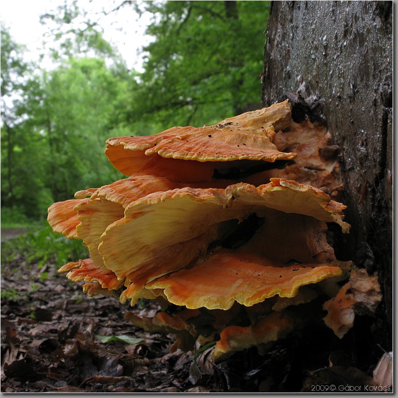 Schau Dir nur mal z.B. die Farbe der Fruchtkörper und diese weisse Bruchkante an. Ich denke auch, dass es sich um Laetiporus sulphureus handelt: