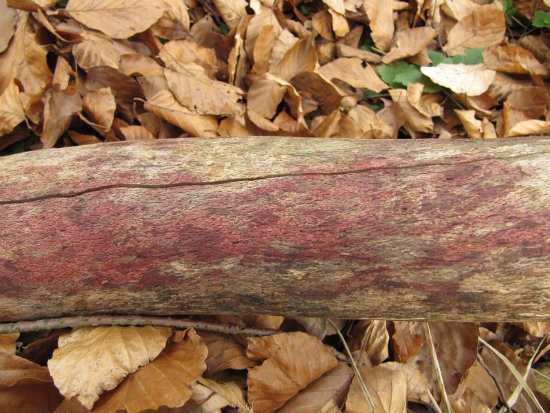 Pilz 2: Ein Pilz, der das Holz zinnoberrot färbt. Nando meinte, das wäre der Pilz, der für das Haareis verantwortlich ist. Habe mal danach gesucht, konnte aber nichts herausfinden. Es sollen auch mehrere Arten Haareis verursachen können.