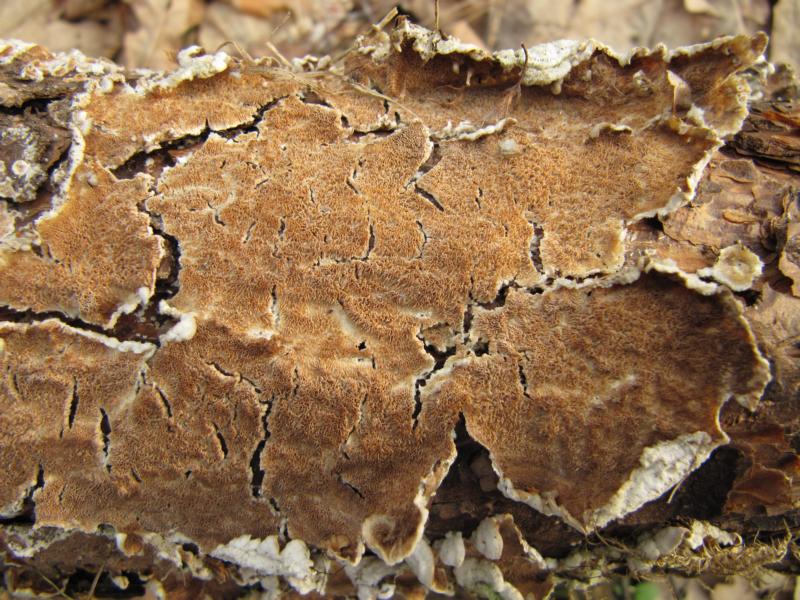 Pilz 4: Ein seltsamer Holzbewohner. Erinnert an den Zahnförmigen Lederporling (Trichaptum hollii), der dort auch häufig war, aber bei diesem hier ist das Hymenophor viel zu hell und ohne Violettton.