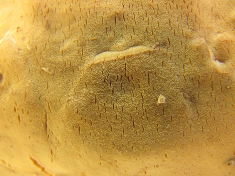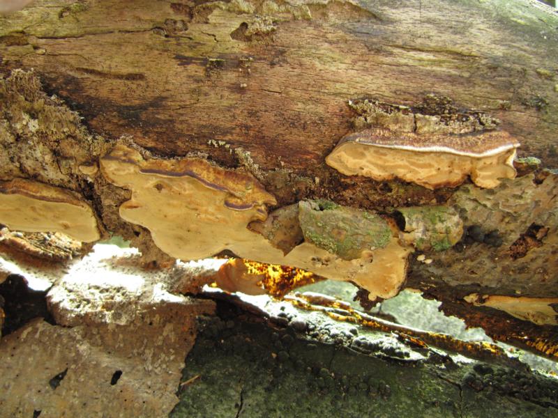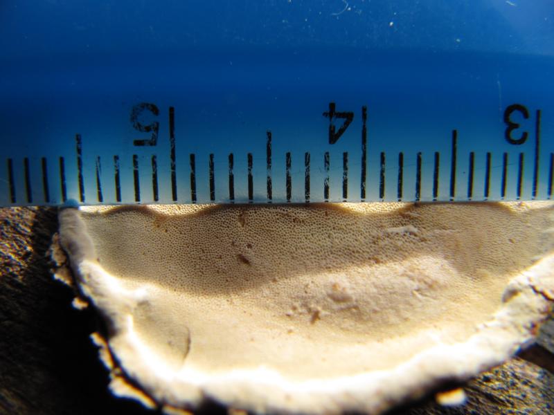 Pilz 5: Dieser Fruchtkörper wuchs an Kiefer. Der Hut war das obere Ende einer größeren Porenfläche, die noch weiter am Substrat herabläuft. Ich schwanke nun zwischen der Striegeligen Tramete (Trametes hirsuta) und der Gilbenden Nadelholztramete (Diplomitoporus flavescens). Für erstere spricht die sehr zottige Oberseite, für letztere das Substrat und die Porenfarbe (und Größe ?).