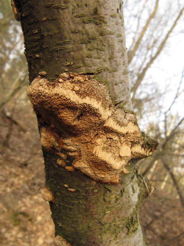 Pilz 2: Ein Feuerschwamm (Phellinus). Bestimmbar? Substrat scheint Kirsche zu sein.