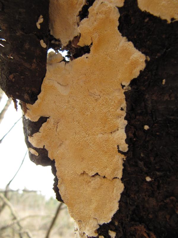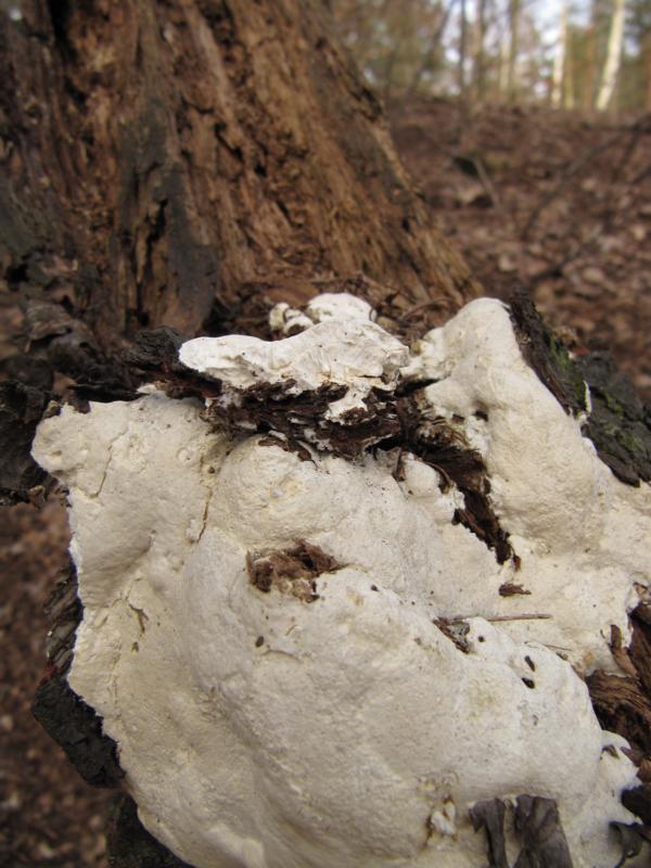 Pilz 3: Diesen hielt ich von weitem schon für Bauschaum. ;-) Es ist aber ein Pilz. Er bildet eine dicke, harte Wulst. Auf der anderen Seite des Substrates wächst er resupinat.