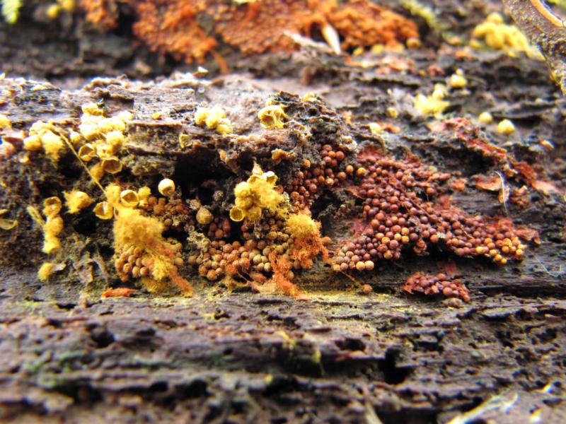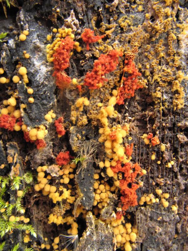 Hallo Doreen! : im Buchenaltholz tummeln sich derzeit einige, eigenartig aussehende Pilze: Ganz genau. Ich und Nando haben so eine alte Buche gestern auch entdeckt. Wir haben uns schätzungsweise eine Dreiviertel Stunde daran aufgehalten. :-) Zwei der von dir vorgestellten Schleimpilze haben wir auch gefunden. (Allerdings nicht an dem angesprochenen Buchenstamm) Sie haben dieses schöne Farbenspiel erzeugt. Ich nehme an, dass es sich, wie bei dir auch (Bilder 1 und 3), um Hemitrichia clavata und Metatrichia vesparium handelt.