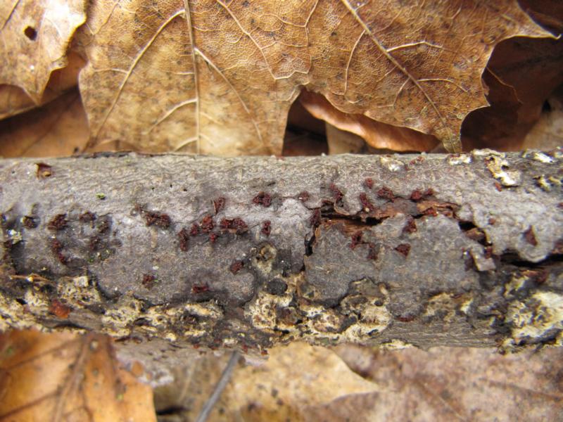 Hallo! Hier der zweite Teil der Pyrenomyceten vom Samstag. Pilz 1: Sicherlich eine Nectria. Aber die gemeine N. cinnabarina ist es wohl nicht. Substrat ist sicherlich ein Buchenast.