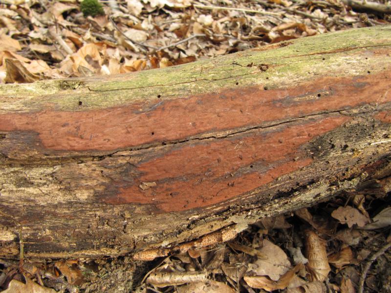 Pilz 3: Ich dachte erst an die Ziegelrote Kohlenkruste (Hypoxylon rubiginosum), aber die ist ja eigentlich wulstig. Beim Ankratzen entstand eine silbrig glänzende Fläche.