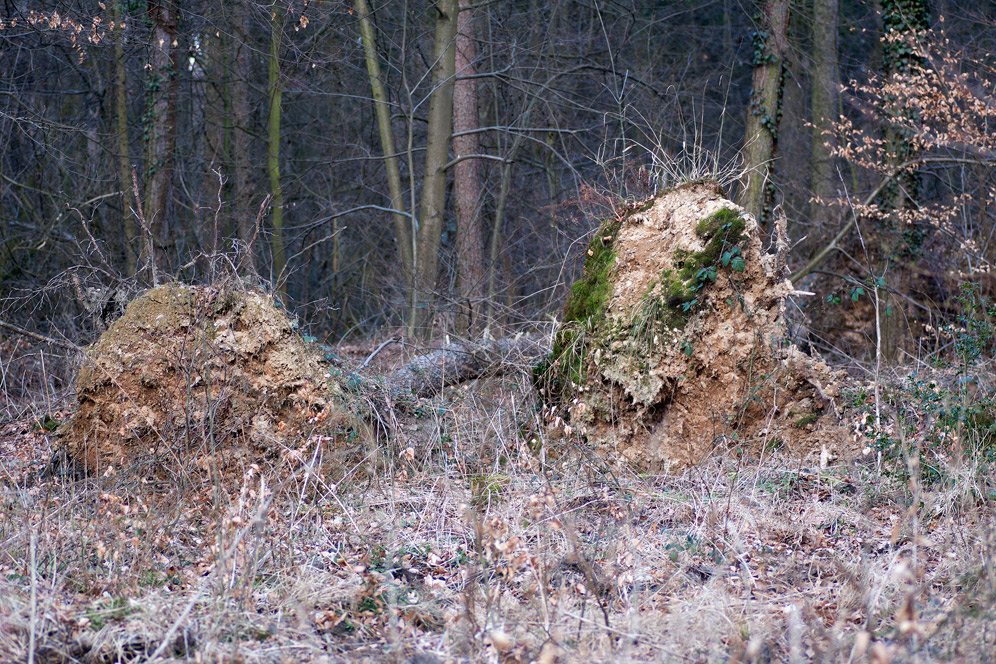 Der Standort im Überblick. Lorcheln habe ich nur an dem rechten Wurzelballen gefunden. Sowohl vorne als auch hinten. Insgesamt waren es geschätzt 20 Exemplare.
