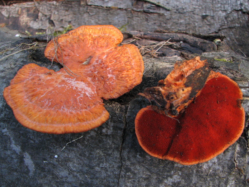 Eine Zinnoberote Tramete auf toter Buche. Erstmalig so ein sattes Rot auf der Unterseite gesehen.