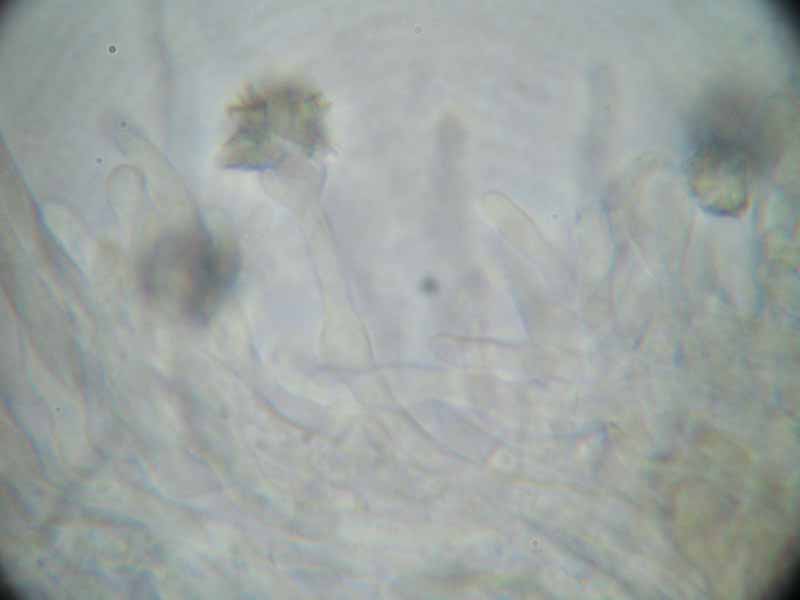 : im Quetschpräparat mit lauter auffälligen Kristallen Zu diesem fällt mir Resinicium bicolor ein, zu den Kristallen könnten solche Zystiden gehören. Meiner war aber mehr gelblich/ockerlich gefärbt. Liebe Grüße