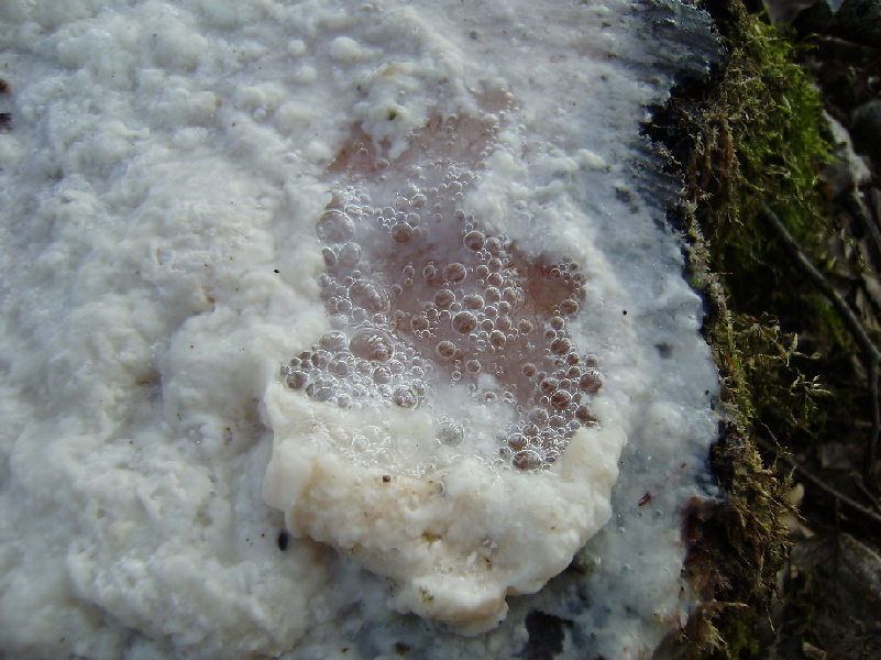 inzwischen habe ich einen frischen Fall gefunden an einer gefällten Birke. Der weisse Glibber ist von einer Konsistenz wie angetrockneter Seifenschaum und sitzt wie eine Haut auf einer klaren Flüssigkeit, die ganz offensichtlich aus der Schnittfläche kommt. Ich denke, der Baum pumpt noch kräftig Wasser aus dem Wurzelwerk nach oben, die zahlreich enthaltenen Nährstoffe setzen sich als Haut oben ab und die später auftretende Rosafärbung kommt von Algen, die sich darauf ansiedeln. Dein Baum hat wahrscheinlich auch irgendwo eine Verletzung gehabt, aus dem das Wasser ausgetreten ist.