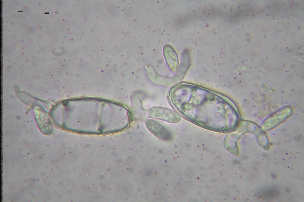 Heute habe ich mir nochmal ein Präparat angeschaut. Es gab einige gekeimte Sporen zu sehen. Hier mal zwei hübsche Exemplare.