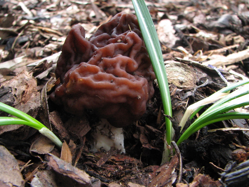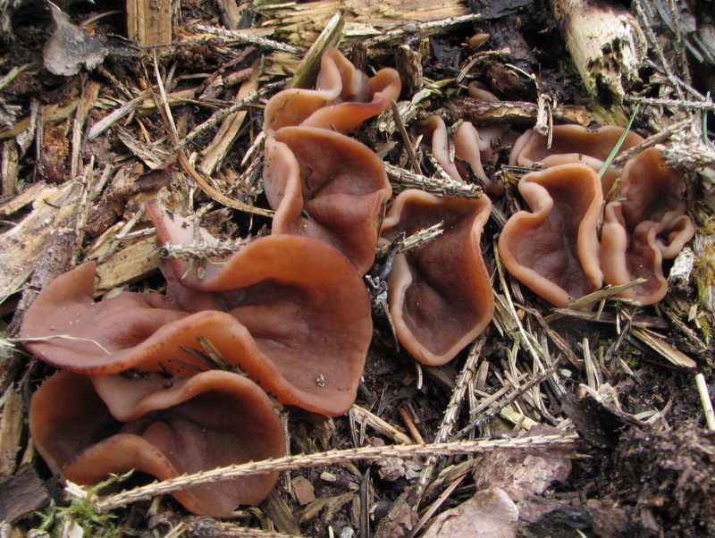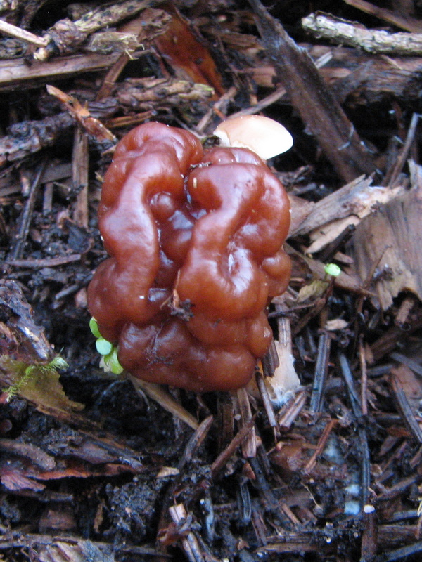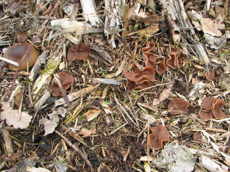Die ersten winzigen Fizarü konnte ich auch schon sichten. Und dann noch in Nachbars Vorgarten diese hier in großer Zahl kommend aus stark verrottetem Rindenmulch. Hier hege ich den stillen Verdacht auf Riesenlorcheln (G. gigas) wegen den „härteren“ Windungsrundungen und den weißen Stielen. Ich werde das weiter beobachten und auch vergleichende Sporenuntersuchungen vornehmen. Den Rindenmulch werde ich mir morgen auch noch genauer ansehen. Kiefern- oder Lärchenrinde wie in meinem Garten ist es auf keinem Fall.