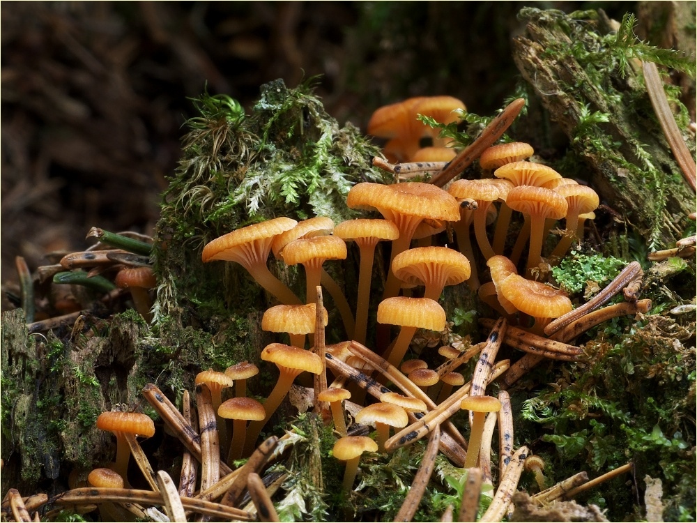 gestern fand ich im Südharz einen Fichtenstubben, der mit kleinen Pilzen übersäht war. Ich dachte an Heftelnabelinge, Rickenella fibula. Die Jahreszeit und den Standort fand ich aber merkwürdig und im Harz mag es ja doch einige Besonderheiten in der Pilzflora geben. Nun bin ich im Laux auf den Gelboliven Ellerling, Hygrocybe grossula gestossen. Meint ihr, dass das hinkommen könnte?