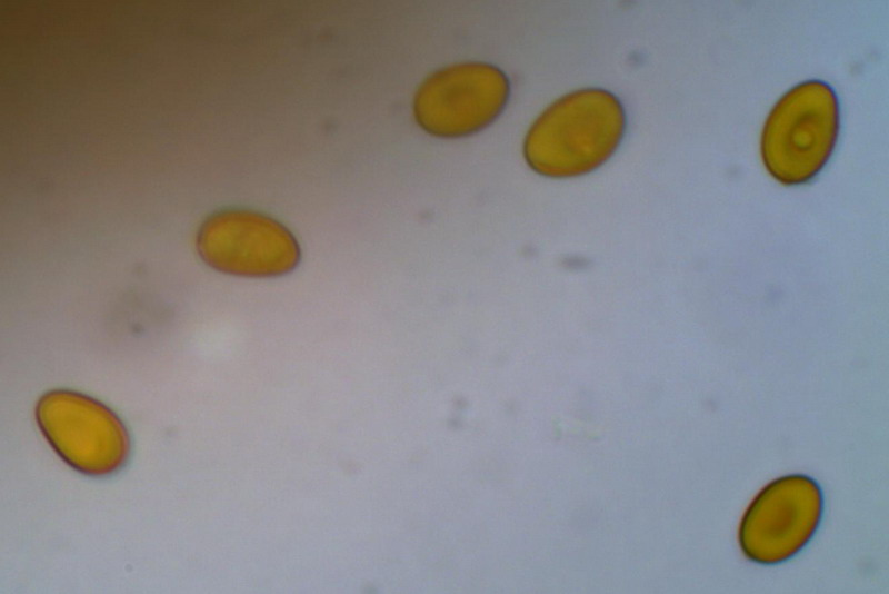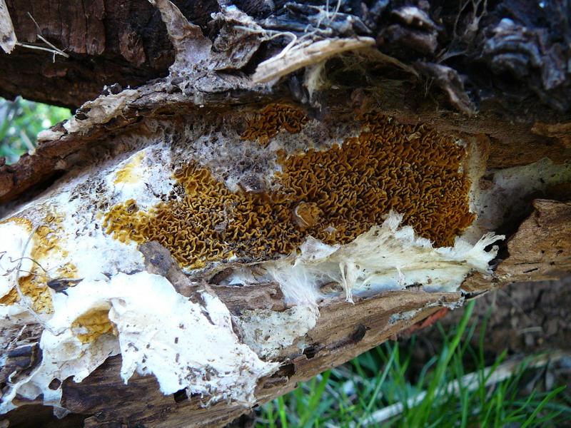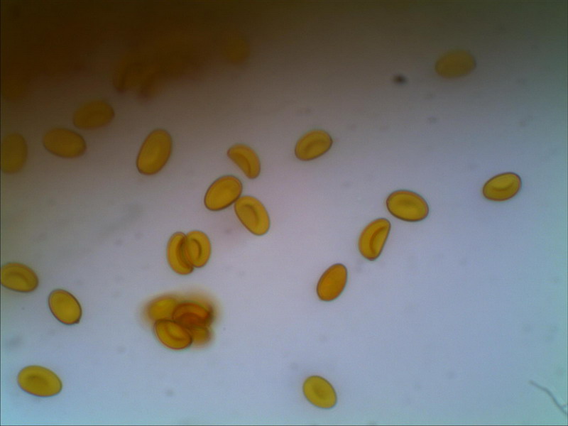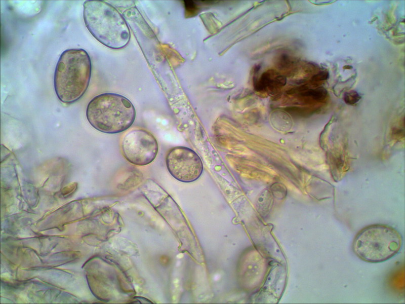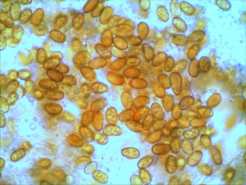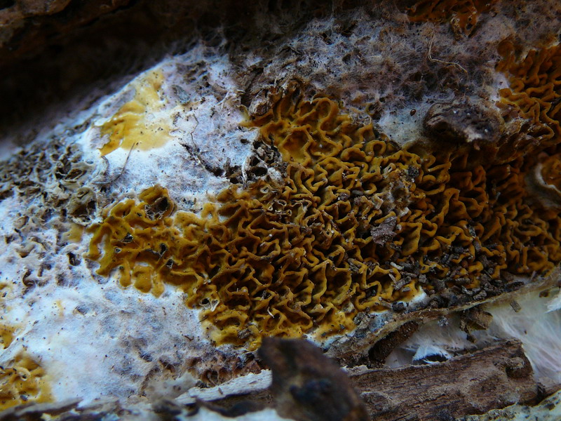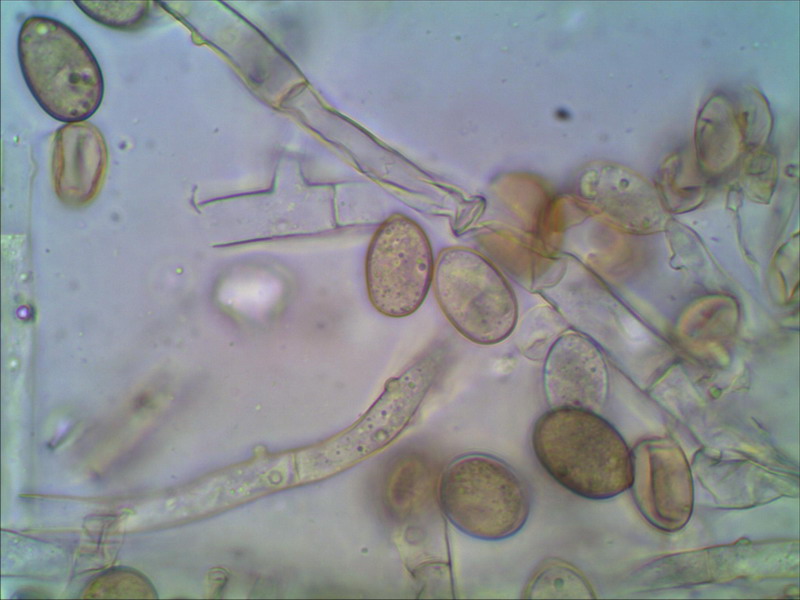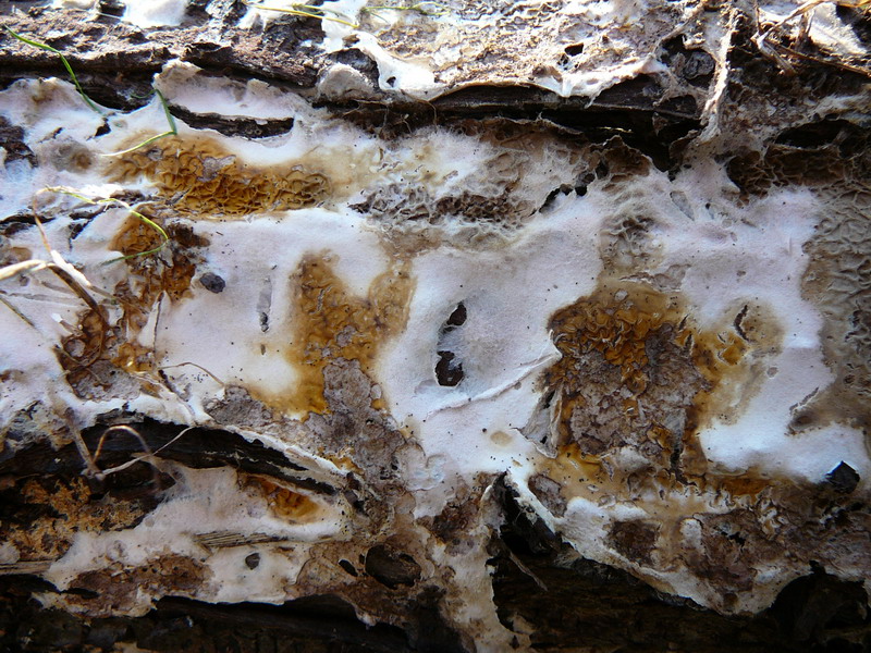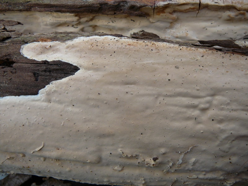 Nun bin ich noch zu keinem Arbeitsnamen gelangt. Leucogyrophana pseudomollusca hat wohl kleinere Sporen und wächst (fast ausschließlich?) auf Nadelholz. In Betracht gezogen habe ich noch Serpula, wofür die Sporen wiederrum zu klein sind. Und die Sporenform mit dieser auffälligen Eindellung (in Wasser mikroskopiert) finde ich auch nirgens wieder. Kann jemand helfen?