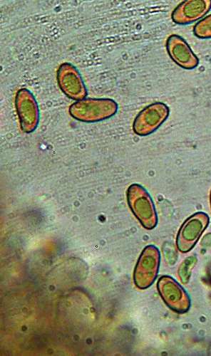 Was nun die Sporenbreite auf meiner Zeichnung und dem Foto angeht, kann ich nur folgendes sagen: Die Messung habe ich von einem Präparat gemacht, wo die Fotos (wie man sieht) nicht so toll waren. Das abgebildete Foto und die Umzeichnung stammen von einem anderen Präparat und einem anderen Fruchtkörper. Aber damit ihr seht, dass die Sporen wirklich sehr schlank sind, hier eines der nicht guten Fotos, wo man aber die Form der Sporen gut sieht.