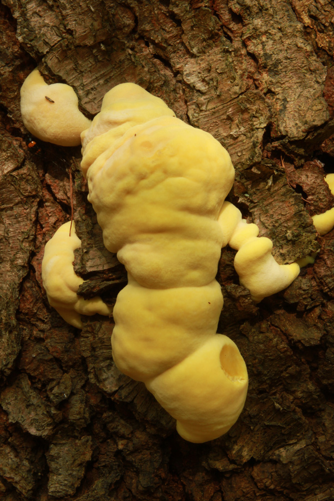 Den abgebildeten Schleimpilz fanden wir gestern im Kalbecker Bruch bei Goch (Niederrhein). Er bewuchs einen abgestorbenen Kiefernstamm und war etwa 10 cm groß. Geruch war keiner feststellbar, er fühlte sich weich an und war im Innern gelb. Kennt den jemand näher?